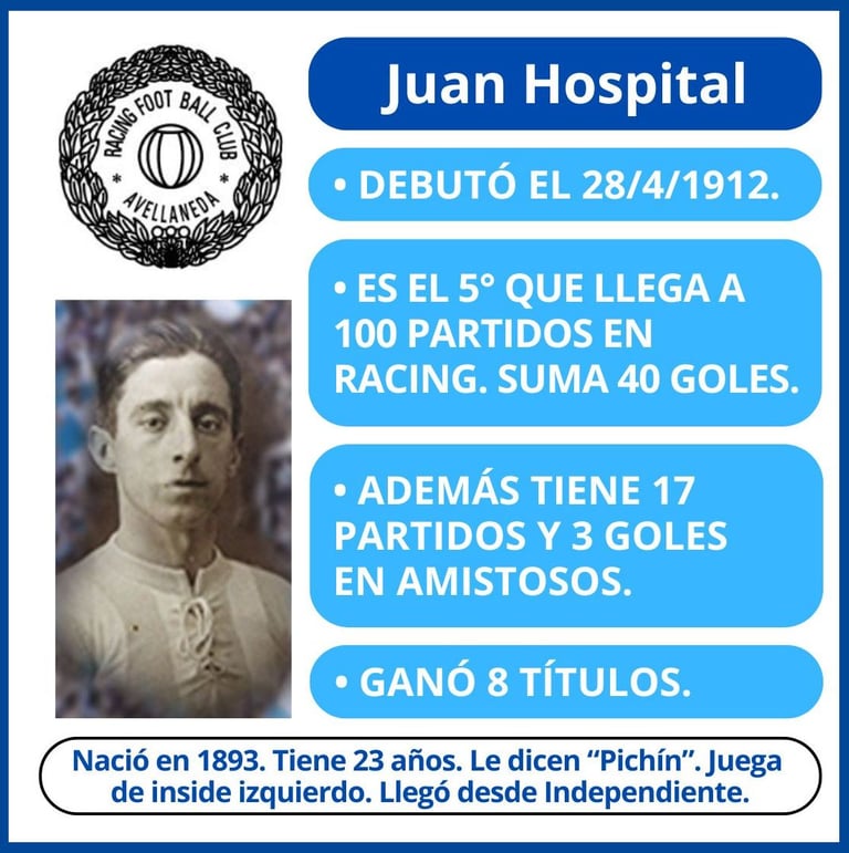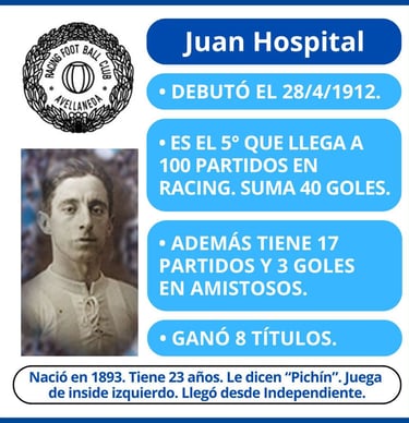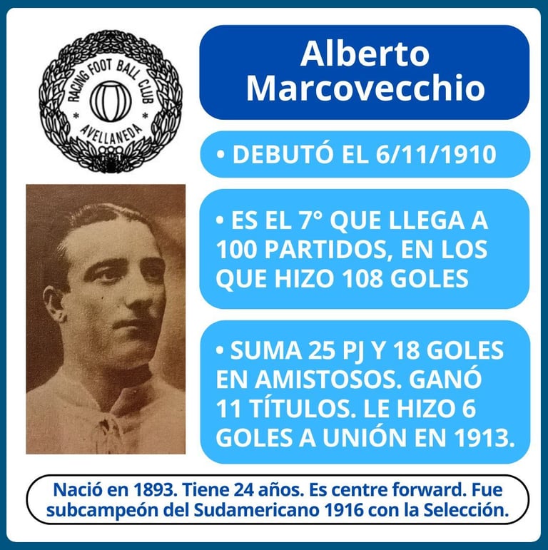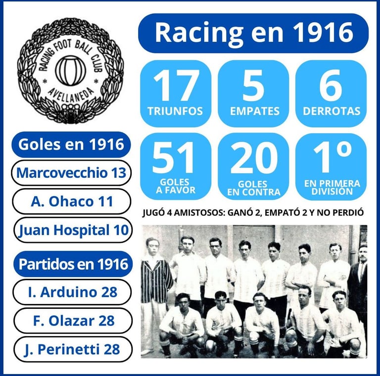 - 4ª fecha del Campeonato de Primera División. Jugado el 23/4/1916. Partido Nº 9 del año, partido oficial Nº 252 de la historia. Racing formó con Arduino; Pepe, Reyes; Betular, Olazar, Juan Viazzi; Canaveri, Nicolás Vivaldo, Alberto Ohaco, Hospital y Juan Perinetti.