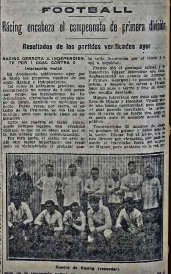 - “Se jugó ayer por la tarde este partido oficial por el campeonato de la A. A. de F. resultando monótono dada la supremacía evidente de Racing” (diario La Vanguardia).