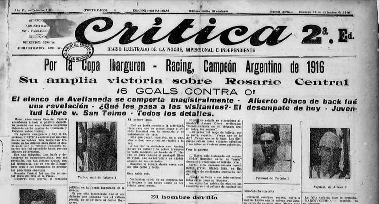 - 2ª fecha del Campeonato de Primera División. Jugado el 16/4/1916 en cancha de Racing. Partido Nº 7 del año, partido oficial Nº 250 de la historia. Racing formó con Arduino; Guillermo Price, Reyes; Juan Viazzi, Olazar, Pepe; Canaveri, Nicolás Vivaldo, Alberto Ohaco, Hospital y Juan Perinetti. Los goles los hicieron Hospital (10’ y 70’), Vivaldo (32’, 55’ y 58’) y Ohaco (75’).